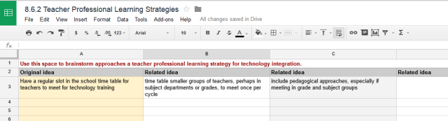 Go to the online collaborative document your tutor has created for you and brainstorm possible strategies for teacher professional learning in technology learning.