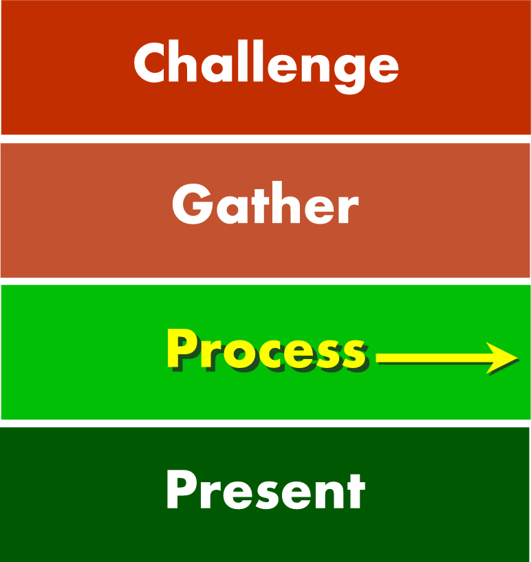 By using a suitable tool, the processing of data and information will naturally emerge from the gathering activities, e.g. a mindmap becomes an outline, a survey becomes spreadsheet data which can be queried, represented graphically and analysed. There are many technology tools for processing information. It is important to assess the potential for technology to enhance the various activities of the processing phase.